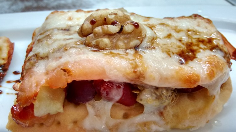 -Coca amb escalivada, anxoves i olives d’Aragó.
