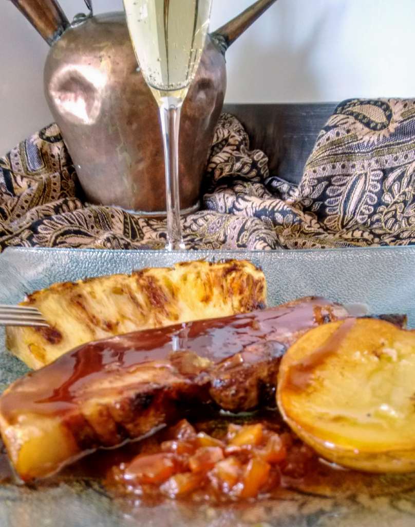 -Galta de porc rostida amb patata al caliu i poma.