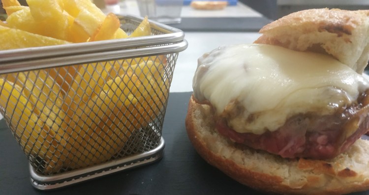 -Hamburguesa de vedella ecológica amb ceba confitada, formatge, bacon i patates fregides casolanes.