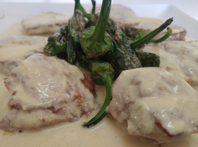 -Costella de porc rostida amb patata al caliu i pebrots del padrón.