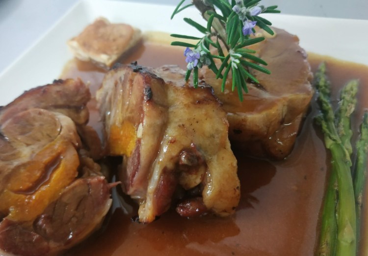 -Galta de porc rostida amb poma i patata al caliu.
